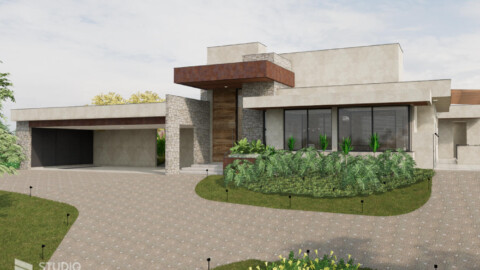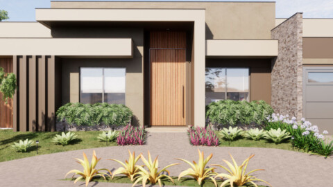 Casa térrea moderna, com linhas inclinadas, fachada com cor...