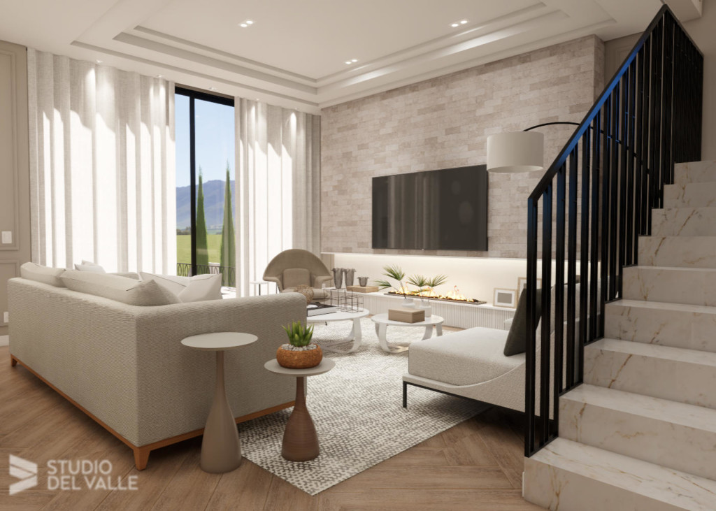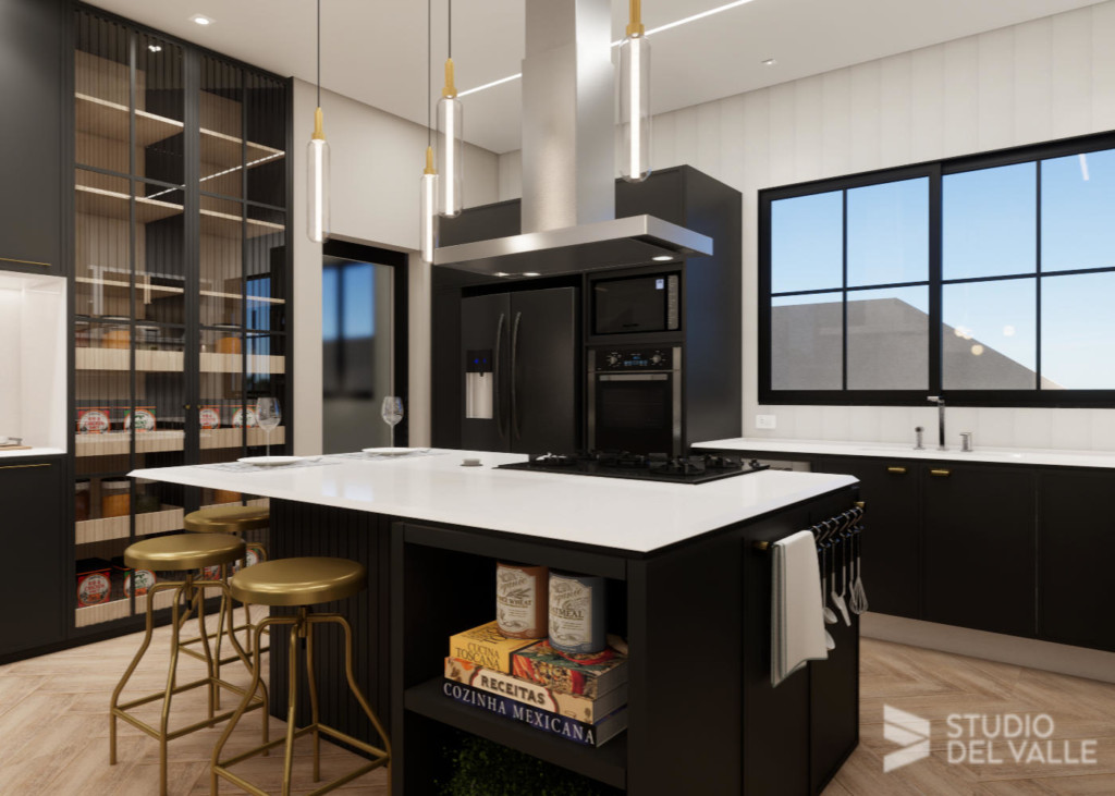Residência com três andares, linhas retas e volumetria marcante. Revestimentos em pedras com grande destaque, tons amadeirados e serralheria escura.