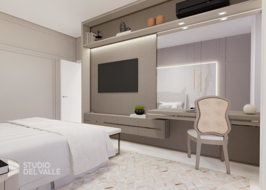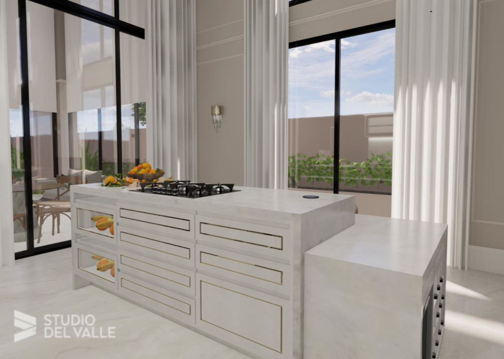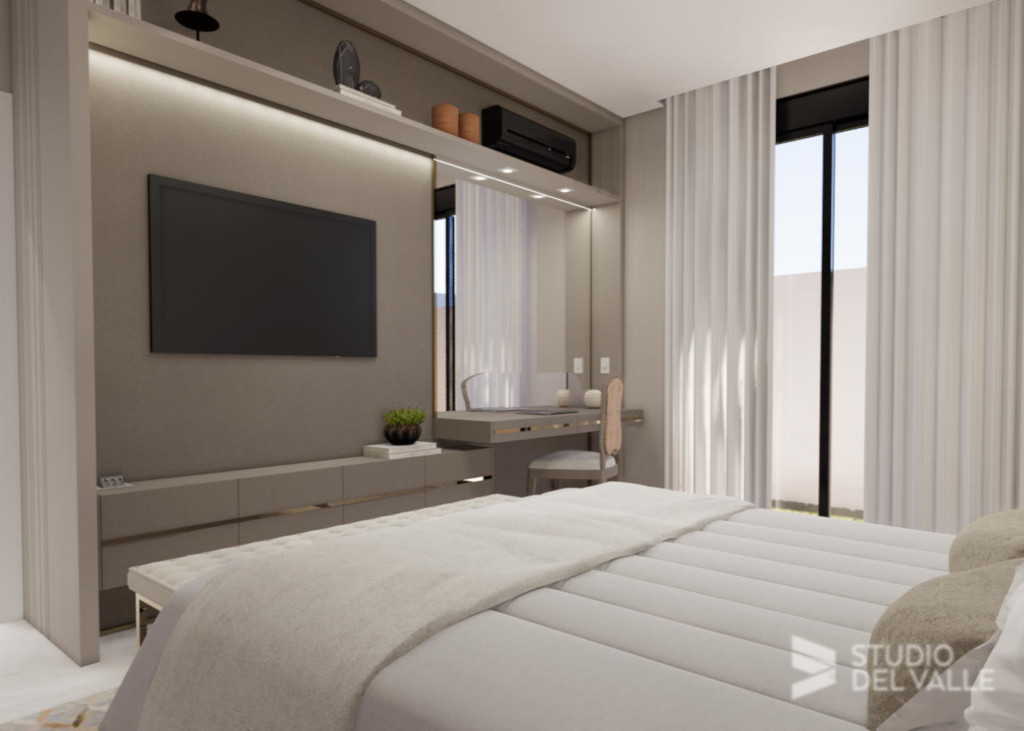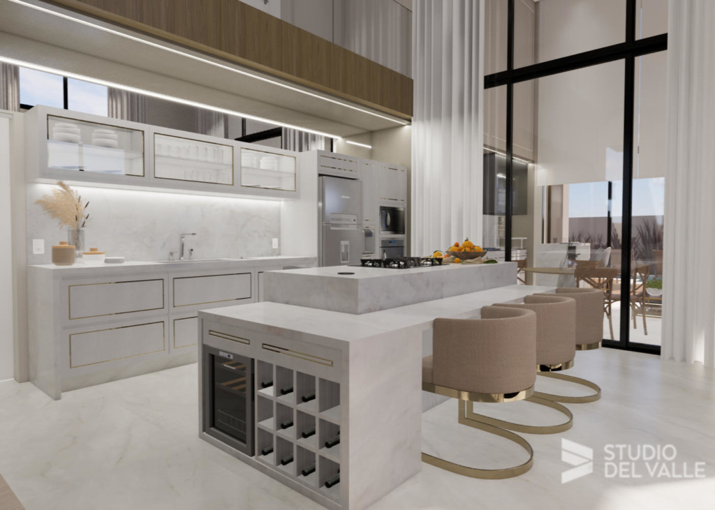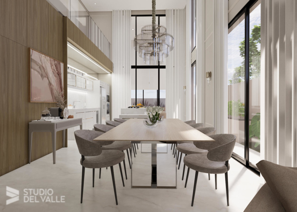 Com princípios longitudinais e pé-direito duplo em todas as áreas de convívio, a sobriedade e amplitude imperam nesta residência. Tons claros são predominantes e a marcenaria completa a sensação de aconchego para os ambientes.