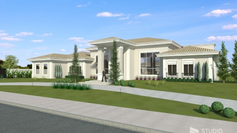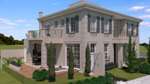 Casa de três pavimentos em estilo neoclássico. A garagem s...