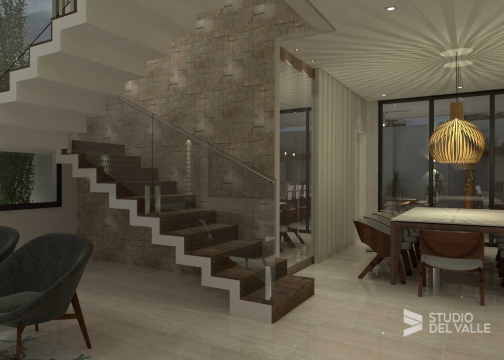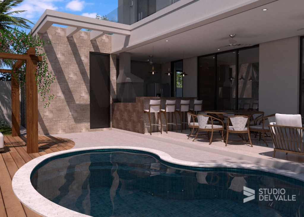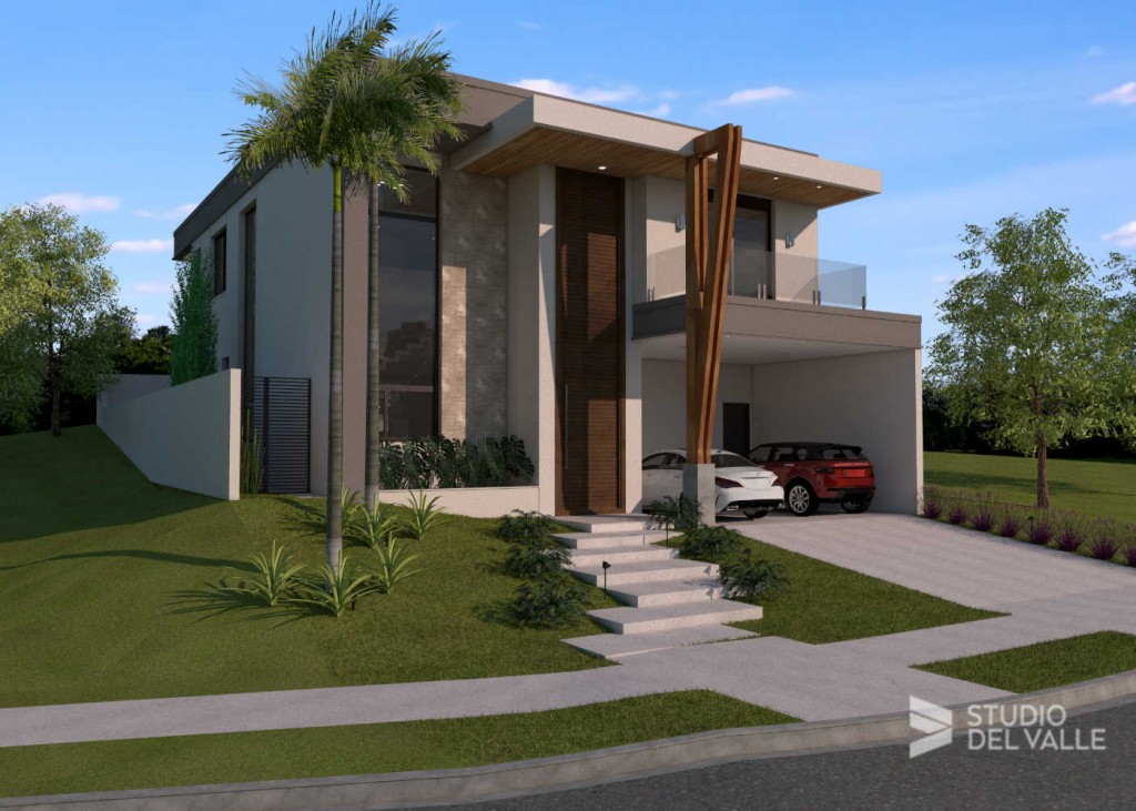 Residência em Campinas em estilo contemporâneo. As linhas verticais da fachada direcionam o olhar para o alto. A escada possui uma grande janela e a porta de entrada é revestida com ripas de madeira que vão até o andar superior. A área de lazer conta com espaço gourmet, churrasqueira, piscina, deck e pergolado.