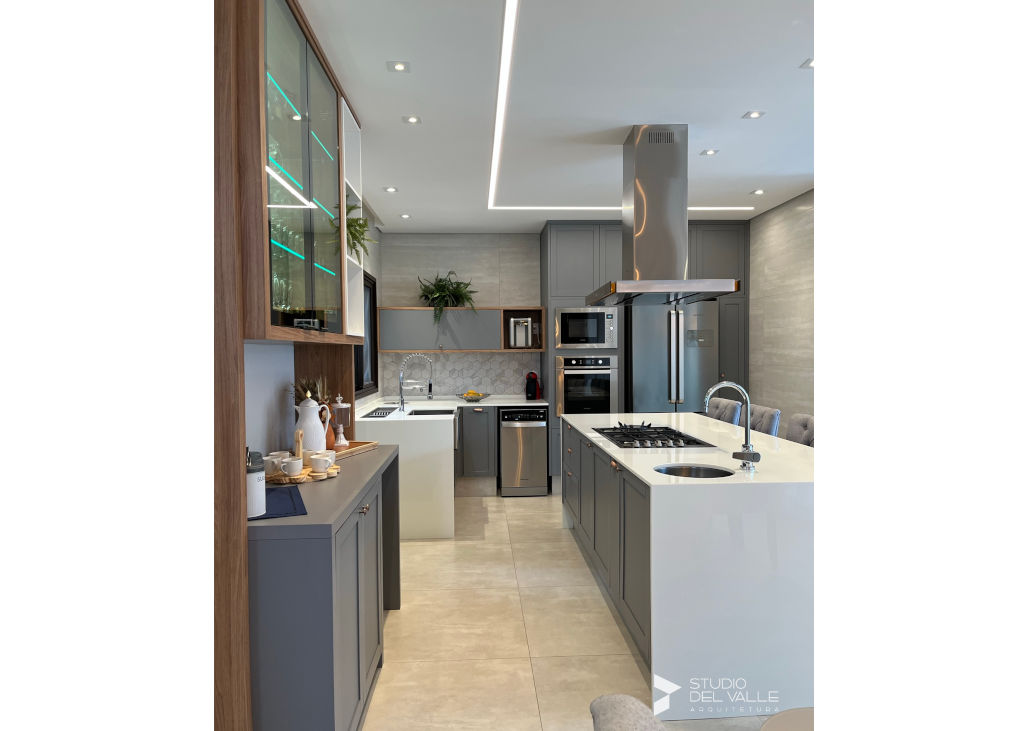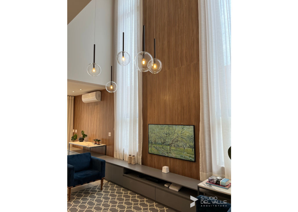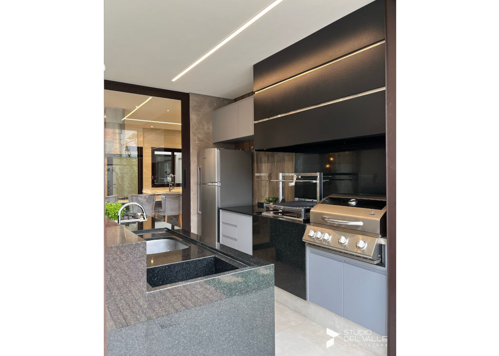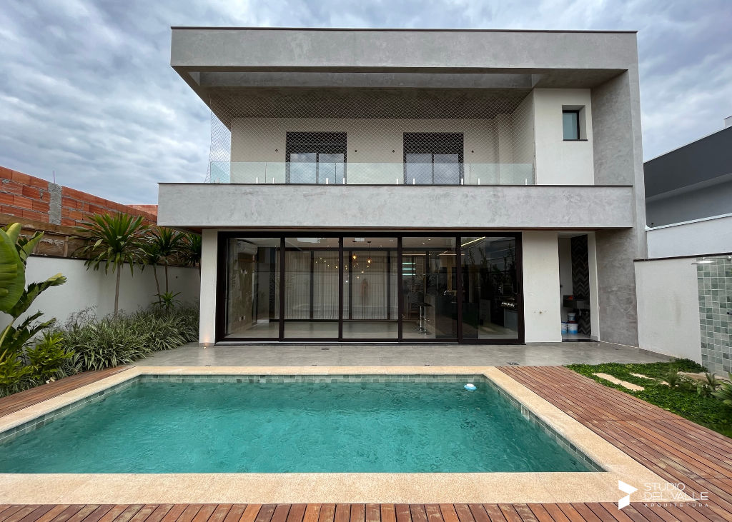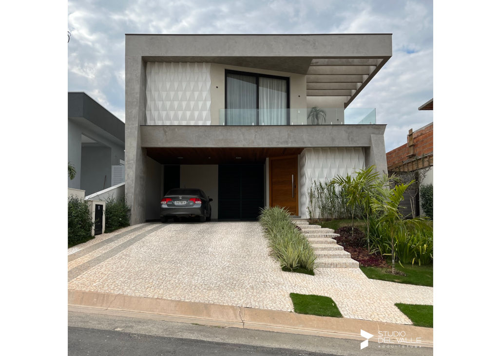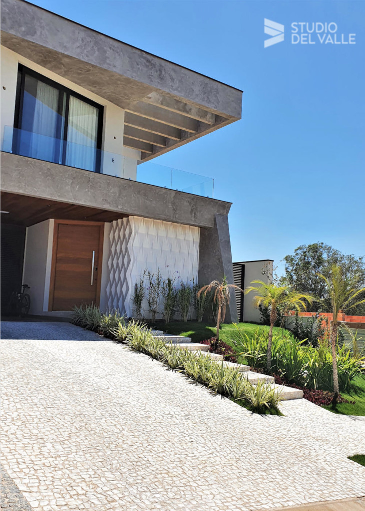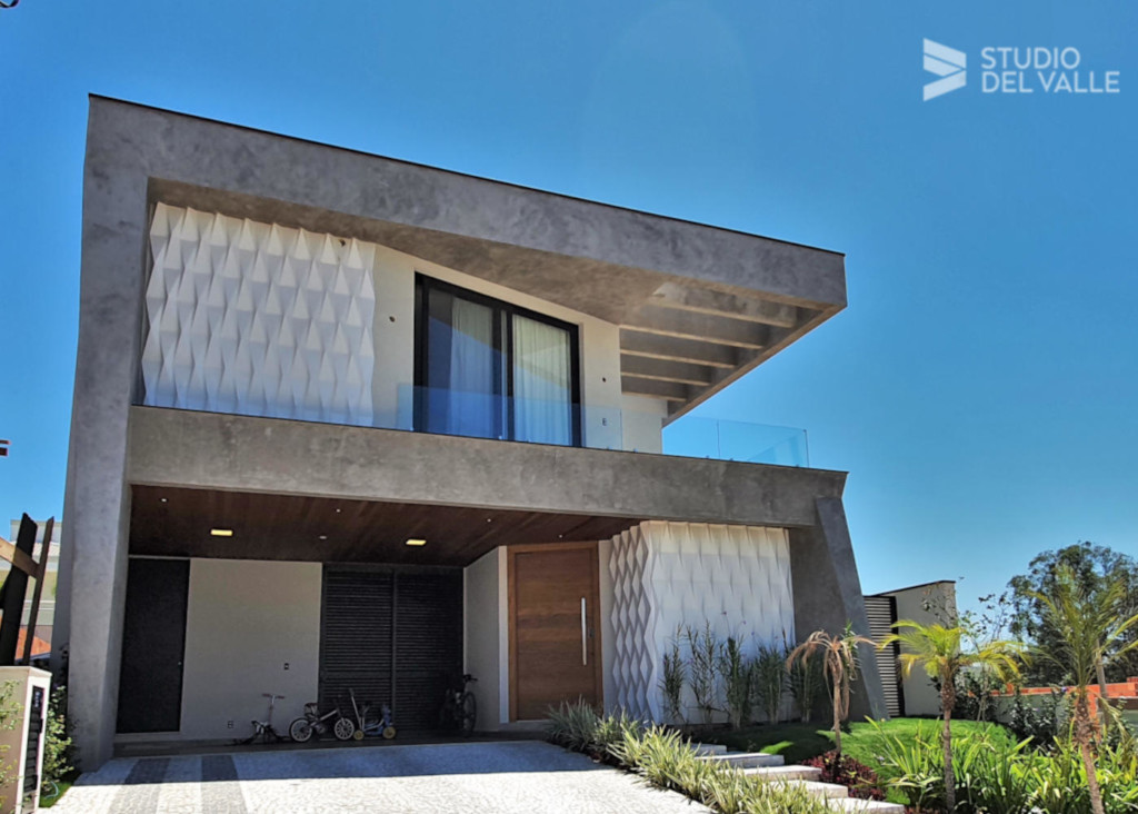 Residência com dois pavimentos em estilo contemporâneo, compostas por linhas retas e cores contrastantes. O revestimentos 3D e o pergolado dão movimento à fachada. A área gourmet envidraçada pode se integrar ao deck e à piscina, dando acesso ao jardim com paisagismo.