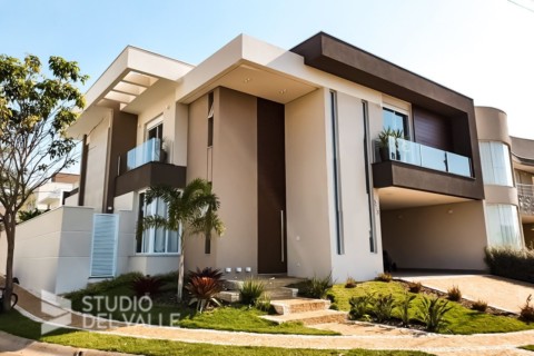 Sobrado contemporâneo com linhas retas e volumetria marcada na fachada. O pé direito duplo no living permite o uso...