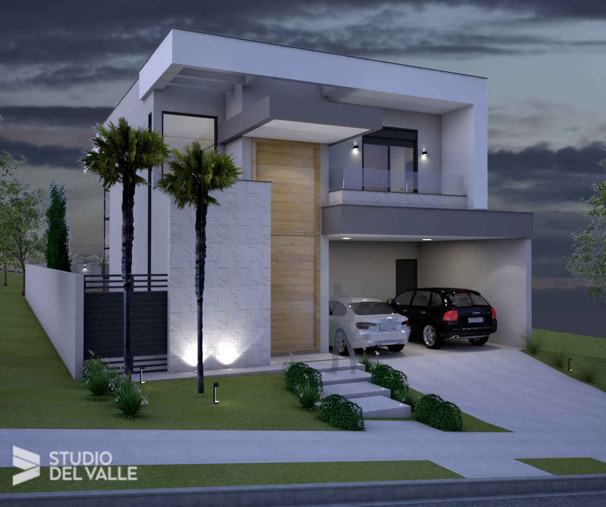 Sobrado contemporâneo com linhas retas e volumetria marcada na fachada em terreno de esquina com leve desnível. Esquadrias brancas...