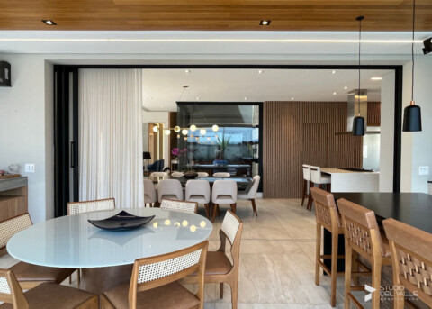 A residência é marcada pelo uso de madeira que aquece e traz aconchego e pelo revestimento em travertino, sendo...